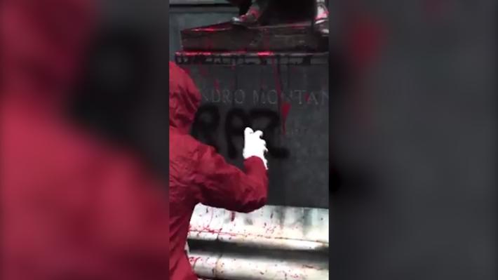 Nel video di 40 secondi si vedono alcuni ragazzi arrivare in bicicletta all’interno del parco e due di loro, stesse scarpe e pantaloni ma giacca di due colori diversi, lanciano i barattoli di vernice contro la statua, per poi scrivere con una bomboletta spray «Razzista, stupratore».