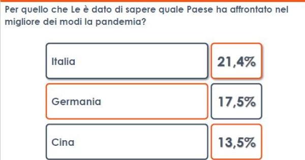 L'Italia riparte dalla "Fase 3 dell'emergenza coronavirus, con la riapertura graduale di tutte le attivita'. Secondo 1 cittadino su 5 (il 21,4%) l'Italia e' stato il Paese che meglio ha affrontato questa pandemia mondiale. Lo evidenzia un sondaggio di Euromedia Research. Ora pero' e' tempo di far ripartire l'economia e i primi interventi richiesti e ritenuti maggiormente utili riguardano l'erogazione di contributi a fondo perduto per le aziende e il pagamento immediato dalla cassa integrazione. I lavoratori autonomi, inoltre, richiedono anche la sospensione dei versamenti fiscali per poter affrontare questa ripartenza. Il provvedimento del Governo sulla regolarizzazione degli stranieri che lavorano nei campi, emanato allo scopo di aiutare il settore agricolo in crisi di manodopera, convince solo 1 italiano su 4. Per quasi i 2/3 degli intervistati, infatti, sarebbe stato piu' utile far lavorare nel settore della raccolta alimentare i percettori di reddito di cittadinanza, in modo da sopperire alla mancanza di manodopera italiana ed evitare, in questo momento, il ricorso alla richiesta di lavoratori proveniente da paesi esteri e ai cosiddetti corridoi verdi. Dati Euromedia Research - Realizzato il 13-05-2020 con metodologia mista CATI/CAWI su un campione di 1.000 casi rappresentativi della popolazione italiana maggiorenne.