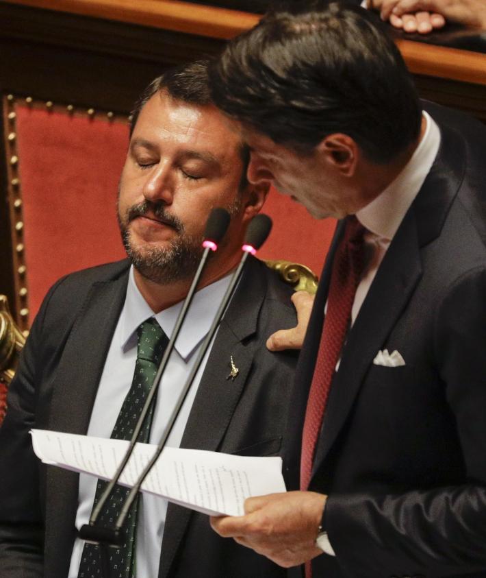 Matteo Salvini scuote la testa più volte, appare molto perplesso mentre il presidente del Consiglio Giuseppe Conte gli snocciola le critiche all'atteggiamento assunto dalla Lega, che accusa di opportunismo politico. Ha lo sguardo fisso al centro dell' emiciclo, dove ci sono i deputati M5S e prende appunti. Luigi Di Maio è immobile: una sfinge: tiene le mani giunte sul banco e scambia ogni tanto una parola con Danilo Toninelli che gli siede accanto.
