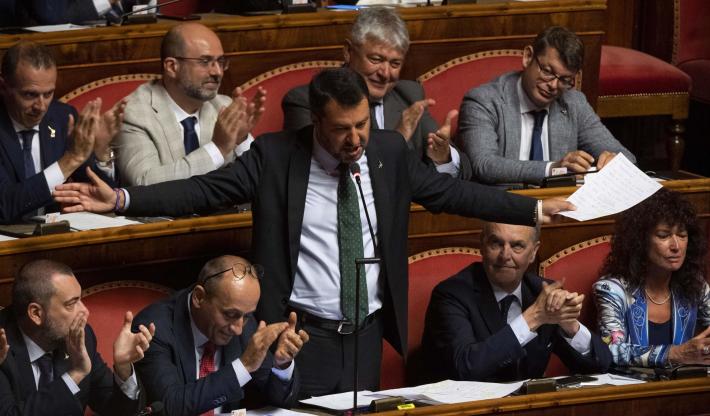 «Grazie e finalmente: rifarei tutto quello che ho fatto». Lo afferma il vicepremier, Matteo Salvini, intervenendo nell’Aula del Senato. «Non ho paura del giudizio degli italiani». Sono qua «con la grande forza di essere un uomo libero, quindi vuol dire che non ho paura del giudizio degli italiani, in questa aula ci sono donne e uomini liberi e donne e uomini un po' meno liberi. Chi ha paura del giudizio del popolo italiano non è una donna o un uomo libero». "La critica più surreale è stata: non si fanno le crisi ad agosto, che i parlamentari non lavorano... Facciamo i ministri un mese si, un mese no?". «Non parlavo male dei colleghi ma l’Italia è più sicura». «Non mi è mai capitato di parlare con Merkel sui propri interessi di partito per chiedere consigli su come vincere le elezioni...Non ho mai preso un caffè lamentandomi che Salvini ha chiuso i porti". «E' una novità di oggi, mi dispiace che il presidente del Consiglio mi abbia dovuto mal sopportare per un anno». replicando al premier Conte ed elencando alcuni aggettivi con cui il presidente del Consiglio l'ha definito: «pericoloso, autoritario, preoccupante, inefficace, incosciente». E ha concluso: «Bastava Saviano per raccogliere tutti questi insulti, un Travaglio, un Renzi, non il presidente del Consiglio». «Se qualcuno da settimane, se non da mesi, pensava a un cambio di alleanza, molliamo quei rompipalle della Lega e ingoiamo il Pd, non aveva che da dirlo. Noi non abbiamo paura». «Si vota anche a settembre, non veniteci a parlare di aumento Iva, di spread, di esercizio provvisorio, di recessione...". «La libertà non consiste nell’avere il padrone giusto ma nel non avere nessun padrone», citando Cicerone. «Non voglio una Italia schiava di nessuno, non voglio catene, non la catena lunga. Siamo il Paese più bello e potenzialmente più ricco del mondo e sono stufo che ogni decisione debba dipendere dalla firma di qualche funzionario europeo, siamo o non siamo liberi?». «A lei che mi ha detto che ho incontrato le parti sociali, dico che non li ascoltava nessuno. E se l’avesse fatto qualcuno prima di me, avremmo fatto in fretta, apriamo all’Italia, senza paura e a testa alta». "La Lega è pronta a sostenere una manovra economica se ha almeno 50 miliardi a bilancio per ridurre le tasse a famiglie, lavoratori e imprenditori italiani, almeno, stando sotto a quello che farà la Francia". «Ho raccolto la settimana scorsa in questa Aula la sfida dei 5 Stelle...». "Gli italiani non votano in base a un rosario, ma con la testa e con il cuore. La protezione del cuore immacolato di Maria per l’Italia la chiedo finché campo, non me ne vergogno, anzi sono ultimo e umile testimone". "Siamo gli unici presunti fascisti che vogliono il voto, pensa che dittatura vorremmo avere? Quella del voto... ". «Omnia vincit amor», l’amore vince sempre», citando Publio Virginio Marone. «Avete scelto il bersaglio, eccomi pronto a sacrificarmi, non c'è problema - ha continuato rivolgendosi alle opposizioni - il mio Paese vale più di mille poltrone, non ho paura e non hanno paura gli uomini e le donne della Lega». "I ministri della Lega sono «gente libera che risponde solo e soltanto alla popolo italiano, non alla Merkel o a Macron" gente che ha «una idea di famiglia e di figli, che hanno una mamma e un papà, e buon lavoro con il partito di Bibbiano».