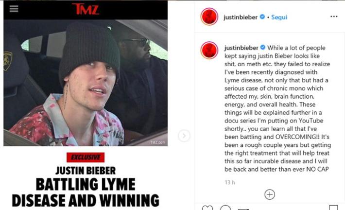 «Mi è stata diagnosticata la malattia di Lyme». Justin Bieber ha rivelato in un post su Instagram il suo momento difficile. «Molte persone continuavano a dire che Justin Bieber sembrava una merda, che ero sotto metanfetamine, ma non si sono rese conto che mi recentemente mi è stata diagnosticata la malattia di Lyme, e anche una mononucleosi cronica che ha colpito la mia pelle, le funzioni del cervello e la mia salute in generale», ha scritto in un lungo messaggio.