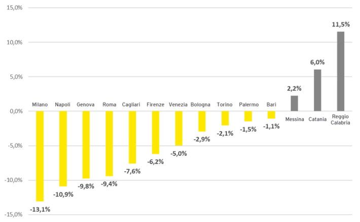 Variazione parco veicolare nei 14 capoluoghi metropolitani dal 2002 al 2018 (%)