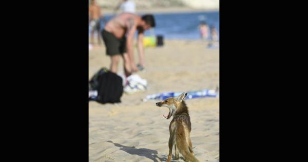 Una volpe rossa (Vulpes vulpes) sta cercando tra i bagnanti in spiaggia qualcosa di buono da mangiare. E' successo a Torre Salsa nella Riserva naturale nel Sud della Sicilia