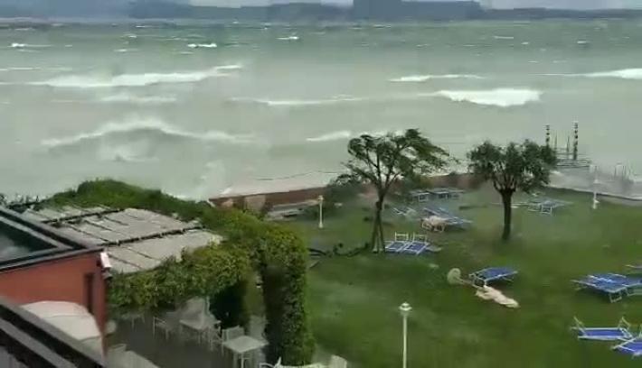 Il video pubblicato dal Centro Meteorologico Lombardo mostra qualcosa di simile a una "storm surge" (l'onda di tempesta) tipica degli uragani che ha investito nella mattinata di oggi le aree costiere del Garda. La forza del vento - con raffiche oltre i 100 km/h - è tale da spingere l’acqua ben oltre la riva. Il video è stato girato a Sirmione, e mostra gli allagamenti subiti da uno degli hotel della zona.