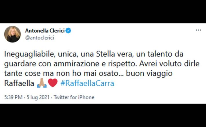 «Raffaella Carrà è stata uno dei simboli della televisione italiana, forse il personaggio più amato. Con i suoi programmi ha saputo parlare a generazioni molto diverse, avendo la capacità di rimanere sempre al passo coi tempi e senza mai scadere in volgarità. Mancherà a milioni di telespettatori che l’hanno amata per il suo stile e a tutti quelli che - come me - hanno avuto l’opportunità di conoscerla e di lavorarci assieme. Io le ho voluto molto bene. Ciao Raffaella».