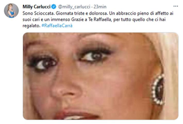 «Sei stata, sei e sarai l’unica regina. Per me, per tutto il mondo. Fuiste, Eres, siempre seras la reina. Para mi, para el mundo entero. @raffaella #raffaellacarrà #rip #dep». Lo scrive su twitter Laura Pausini, commentando la scomparsa dell’artista e conduttrice.