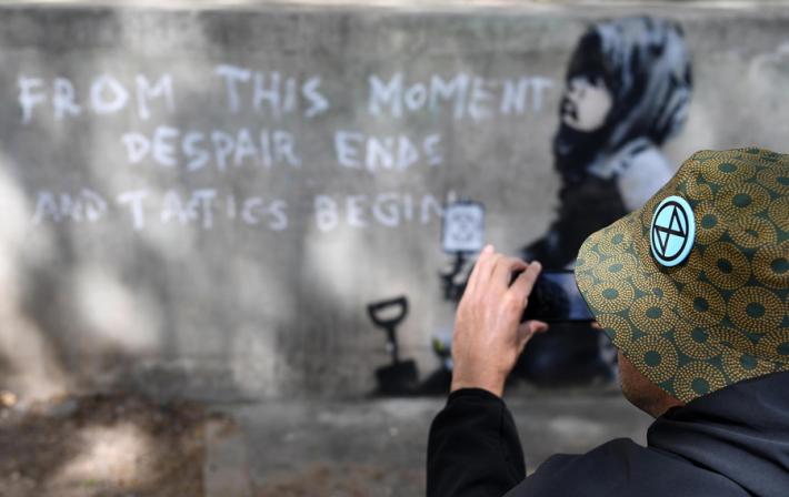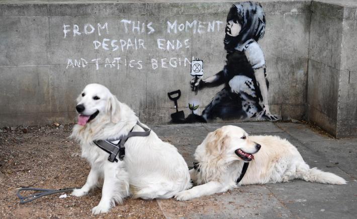 Fra le oltre 1100 persone fermate dalla polizia britannica in 11 giorni di proteste, happening e blocchi stradali o dei trasporti conclusisi  l'altro ieri a Londra per denunciare "l'emergenza dei cambiamenti climatici" nessuno è stato identificato come Banksy. Ma il misterioso artista militante di Bristol ha lasciato traccia pure fra i partecipanti alle manifestazioni di Extinction Rebellion: il movimento ambientalista radicale che in questi giorni ha colorato e talora paralizzato la capitale del Regno.