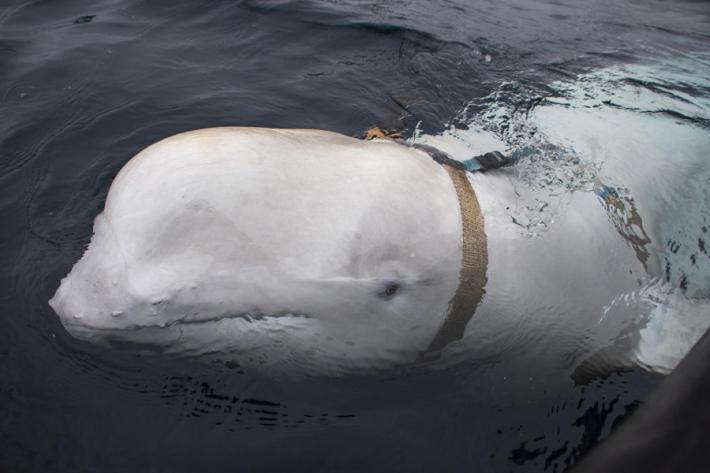 Una balena beluga è stata avvistata e fermata da dei pescatori a largo della costa norvegese settentrionale. Dopo aver rimosso l'imbracatura stretta, hanno notato una montatura per una action camera. Il sospetto è che l'animale potrebbe essere fuggito da una struttura militare russa.