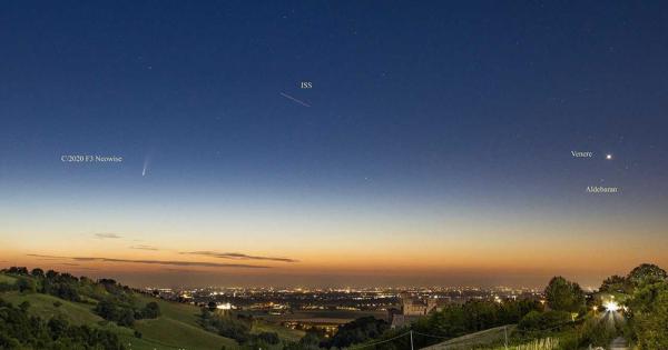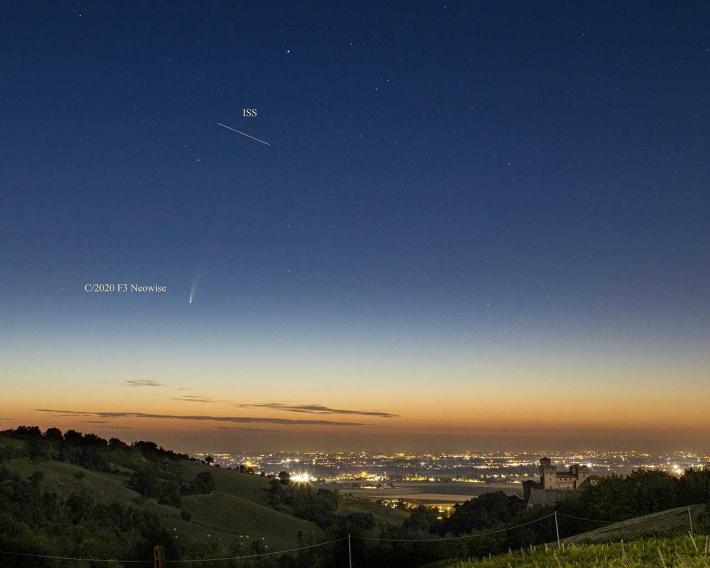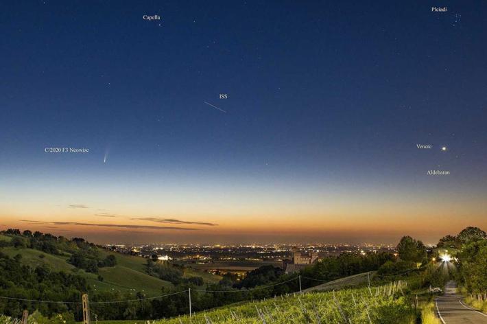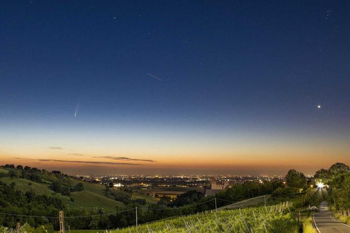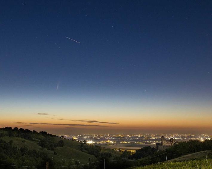 Antonio Giannicola Colangiulo è un appassionato di fotografia ed astronomia di Felino che ci ha mandato alcune foto scattate la scorsa notte a Torrechiara della cometa che sta solcando i nostri cieli. Oltre a due foto panoramiche del castello di Torrechiara con il passaggio della cometa e, contemporaneamente, della ISS (Stazione Spaziale Internazionale) visibile come una strisciata luminosa nel cielo e le due stesse foto con le nomenclature degli oggetti celesti fotografati. Inoltre una foto ravvicinata della cometa.