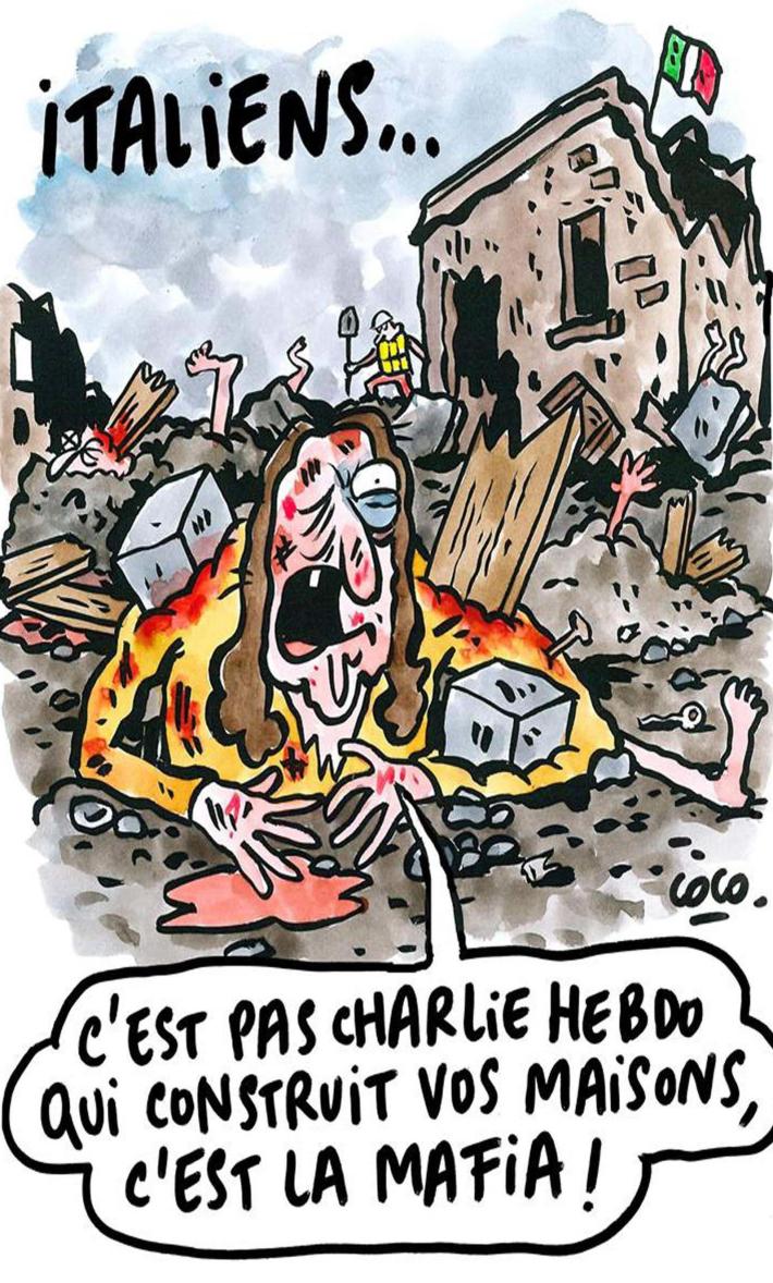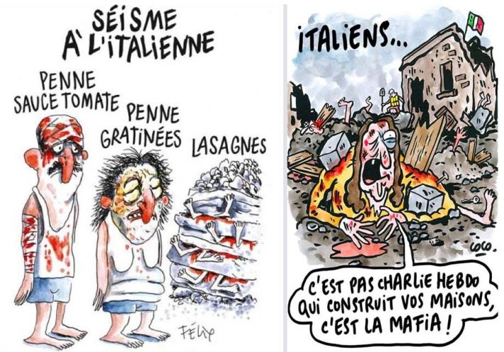 Frequento la Francia da una vita, amo la Costa Azzurra: è semplicemente splendida. Tutti abbiamo pianto le vittime di Parigi, una di loro era anche un amico. Tutti abbiamo pianto le vittime di Nizza, per me è come se avessero colpito la mia, la nostra città. Tutti abbiamo pianto e siamo inorriditi per le vittime di Charlie Hebdo: da giornalista, poi, l'attacco ha assunto un doppio significato, un colpo sanguinoso alla libertà di stampa, di satira. In tanti abbiamo aderito ai vari hastag (nello specifico #JesuisCharlie) nati dopo questi vili colpi alla spensieratezza, al lavoro e alla nostra vita quotidiana. Ora, proprio il giornale satirico Charlie Hebdo è tornato a colpire con le sue matite colorate. Ma questa volta ha colpito le macerie, ancora fumanti, del terremoto del Centro Italia. Una vignetta che non mi piace, non ci piace.«Terremoto all'italiana: penne al sugo di pomodoro, penne gratinate, lasagne». Due uomini in canottiera (loro vedono così noi italiani) insanguinati (il richiamo al sugo di pomodoro è più che evidente) guardano le macerie disegnate come una mega lasagna, da dove spuntano braccia e piedi di diverse persone sepolte da strati di pasta/macerie. Da qui una mega ondata di indignazione con insulti di vario genere sui social. Immancabili i soliti interventi dal mondo politico. Dalla redazione, dopo il silenzio, è arrivata la precisazione, ça va sans dire, attraverso una vignetta: il primo disegno non voleva prendere di mira le vittime ma gli abusi edilizi che hanno portato alla tragedia. Ma anche la seconda vignetta non ci piace, anzi, rincara la dose di banalità e meschinità.