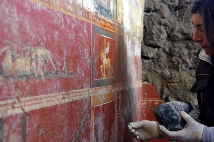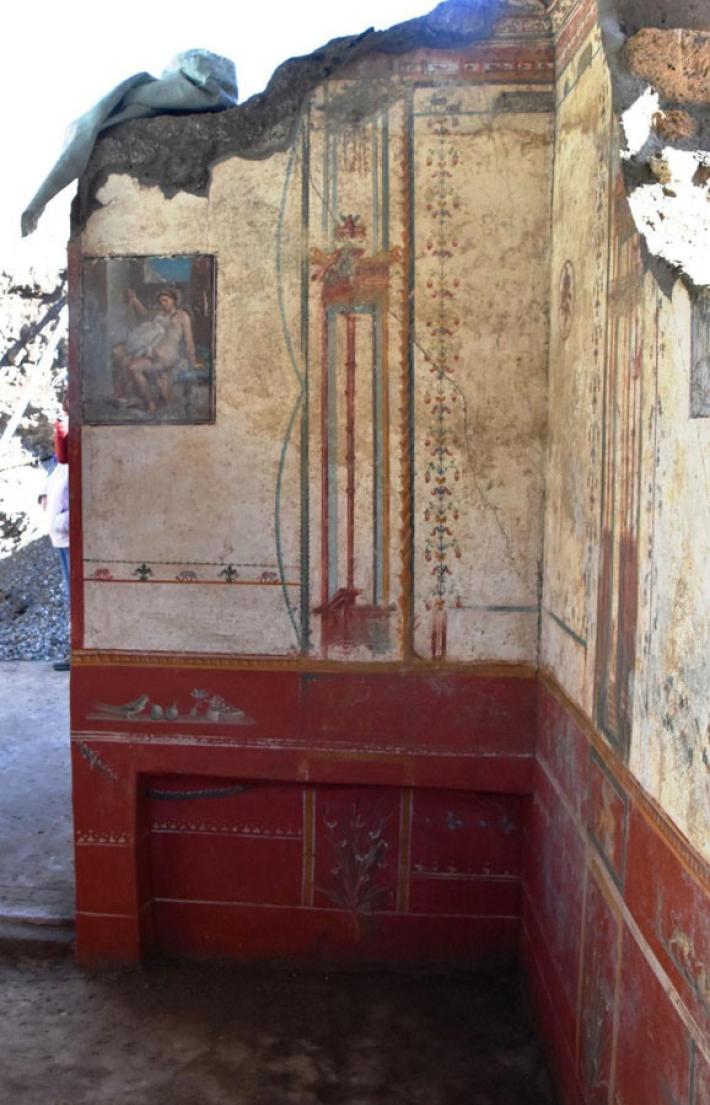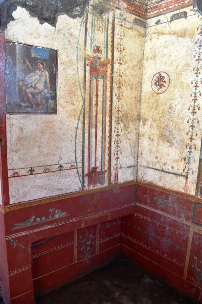 Decori raffinati di IV stile, spiegano gli archeologi che hanno condotto lo scavo con la direzione scientifica di Massimo Osanna, «caratterizzano l'intera stanza di Leda, con delicati ornamenti floreali, intervallati da grifoni con cornucopie, amorini volanti, nature morte e scene di lotte tra animali. Finanche sul soffitto, rovinosamente crollato sotto il peso dei lapilli, si estendeva l'armonia di questi pregiati disegni, i cui frammenti sono stati recuperati dai restauratori per ricomporne la trama». Non solo: «Interessante, nell’atrio di Narciso, è la traccia ancora visibile delle scale che conducevano al piano superiore, ma soprattutto il ritrovamento nello spazio del sottoscala, utilizzato come deposito, di una dozzina di contenitori in vetro, otto anfore e un imbuto in bronzo. Mentre una situla bronzea (contenitore per liquidi) è stata rinvenuta accanto all’impluvio».