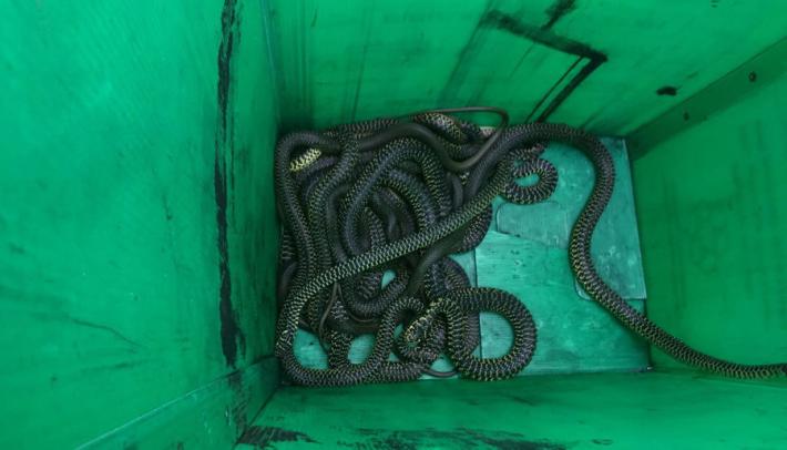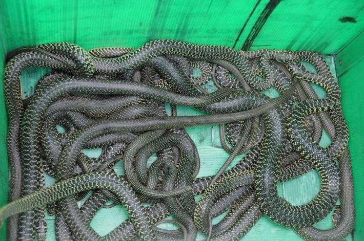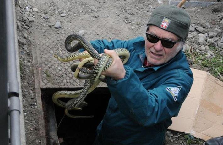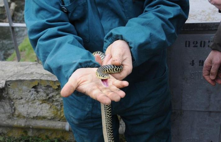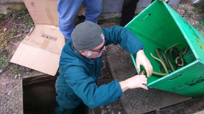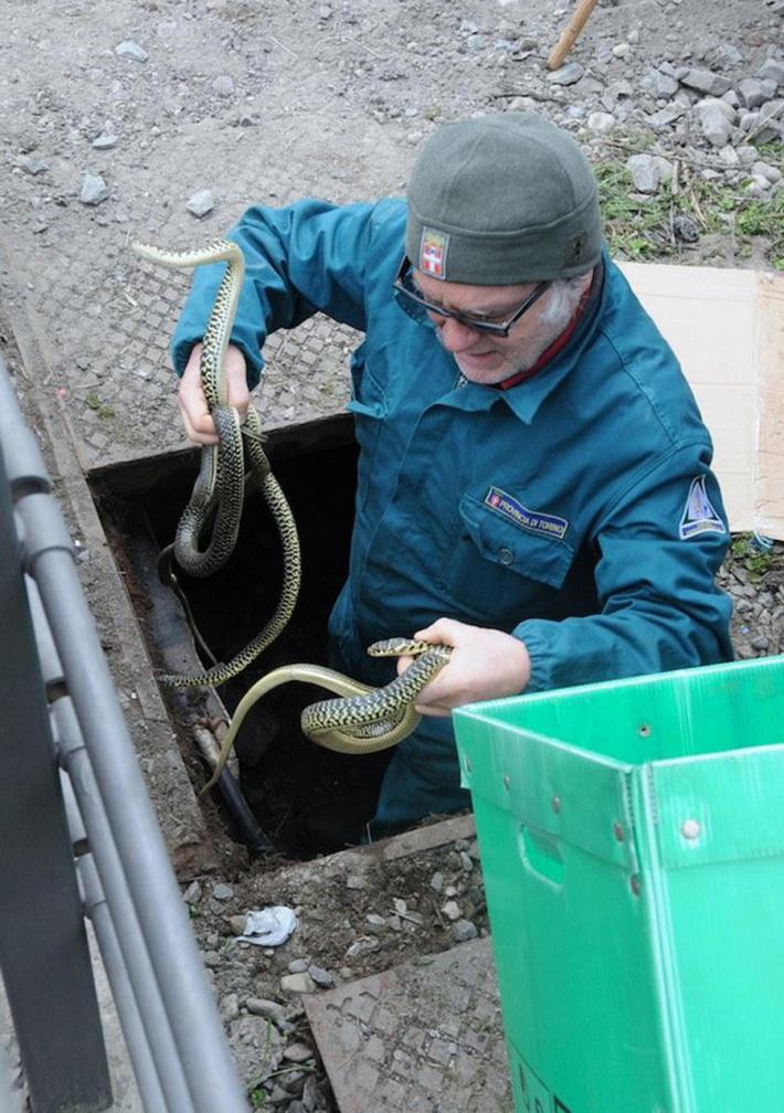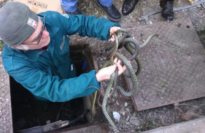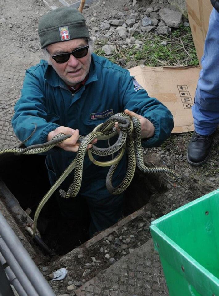 Recuperati in un tombino a Carignano (Torino) una ventina di serpenti biacco, il cui morso non e' velenoso.