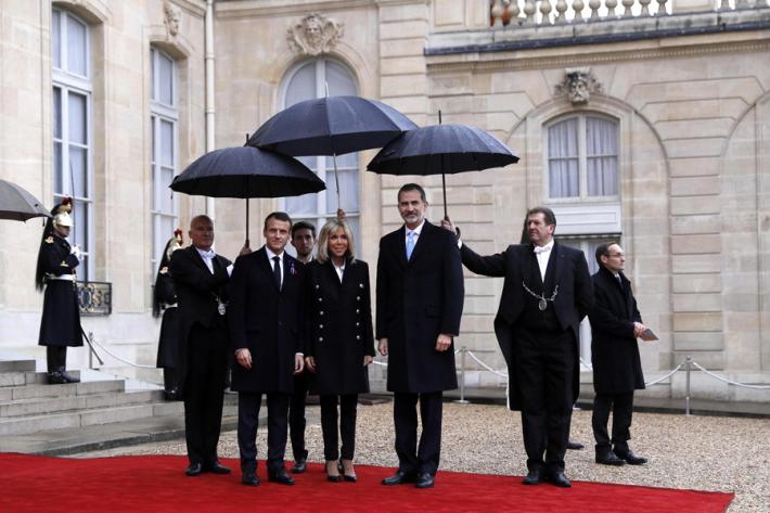 Donald Trump, con la moglie Melania, ha camminato lentamente portando da solo l’ombrello e passando a stringere le mani di Macron e degli altri in prima fila, poi parlando affabilmente con Angela Merkel, accanto alla quale segue la cerimonia.