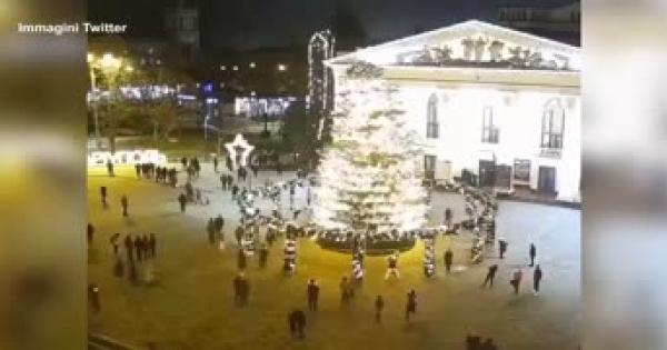 E' accaduto a Mariupol, l'abete di 14 metri fatto cadere dal vento