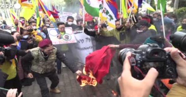 Manifestanti tibetani bruciano una bandiera cinese: "Sono i Giochi del genocidio"