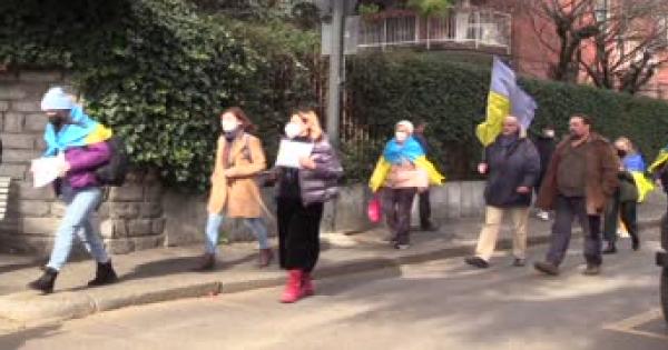 "No war" e "Stop Putin" si legge sui cartelli avvolti dalle bandiere italiane e ucraine