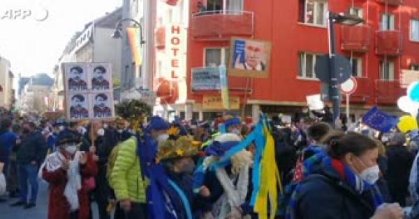 Bandiere giallo-blu, carri allegorici e cartelli contro Putin