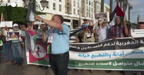 Attivisti in strada a Rabat con striscioni, cartelloni e bandiere palestinesi