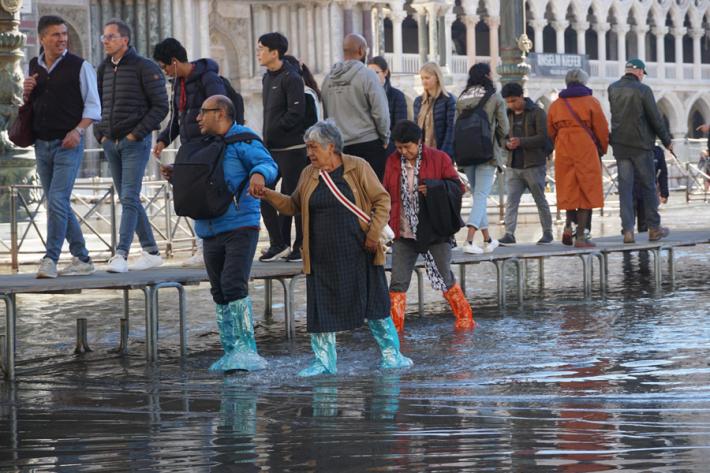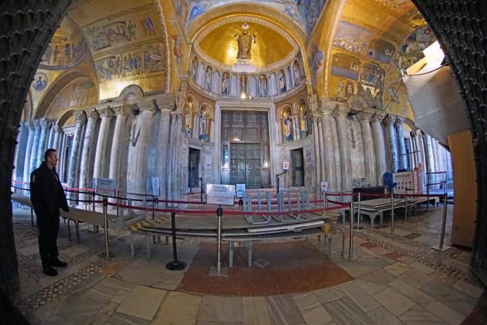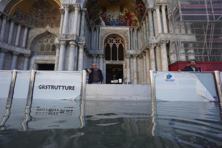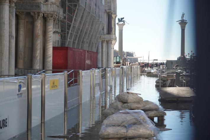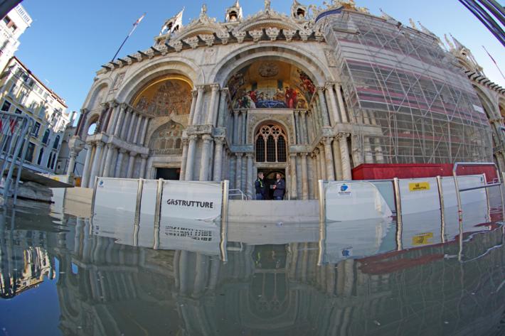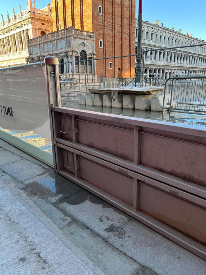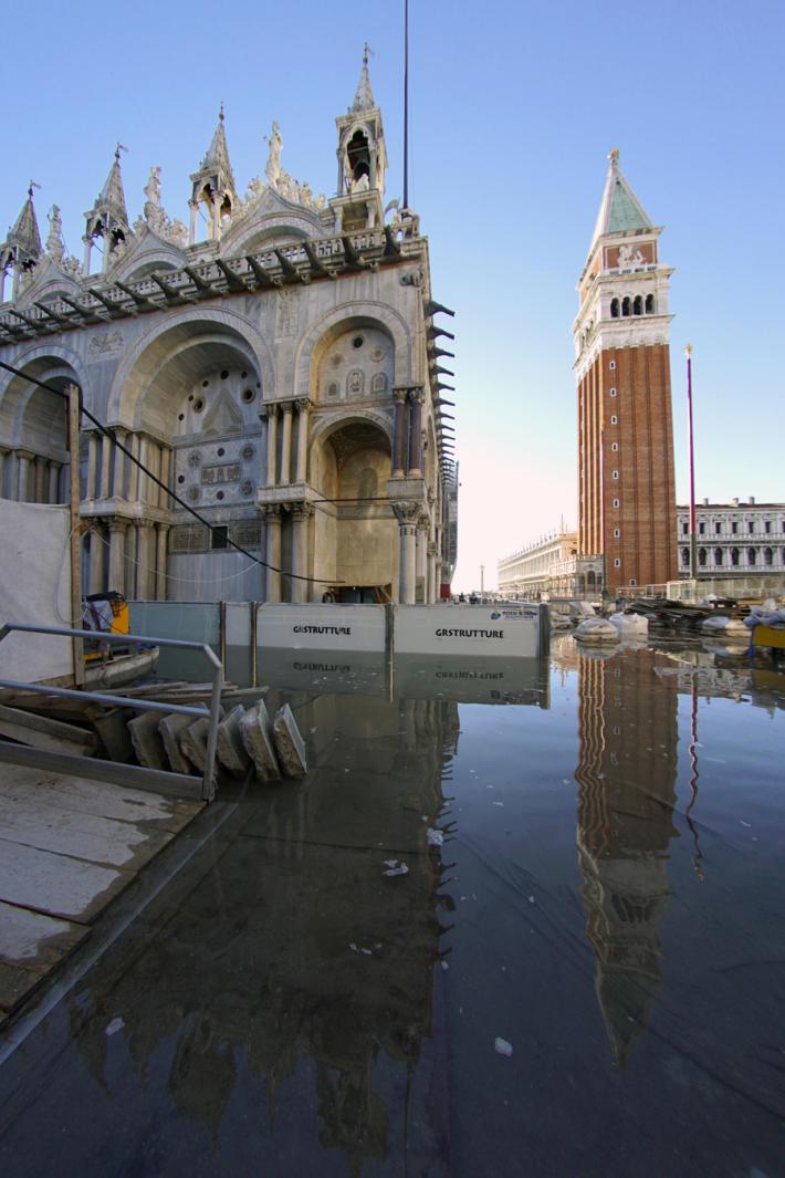 Adesso invece San Marco è protetta dalla 'cinturà trasparente che in questi ultimi mesi è stata allestita attorno al perimetro del monumento: 130 metri di balaustra trasparente, con lastre di cristallo lunghe 5 metri ciascuna per 1 e 30 di altezza, che sigilla il perimetro del capolavoro bizantino. Un’immagine mai vista prima quella di questa prima domenica di novembre: fuori della cintura l’acqua che sommergeva la piazza, dentro il recinto il selciato asciutto, la chiesa protetta dalla marea. Una soluzione light e temporanea, in attesa del completamento dei lavori (molto più lunghi) che porteranno al rialzo dell’intera insula di San Marco. Le barriere in vetro - non ancora inaugurate - sono fisse, tuttavia disturbano in modo minimo la vista del tempio. Presentano 4 varchi, due laterali e due all’ingresso principale, nei quali paratie in metallo, simili a quelle usate nelle case e nei negozi veneziani, vengono inserite a 'ghigliottinà solo nei casi di acqua alta. Un’opera costata 5,3 mln di euro, contro i 50 mln che serviranno per mettere in sicurezza l’insula. «Oggi le paratoie del Mose non sono state chiuse, eppure la barriera provvisoria (che durerà qualche anno) difende la Basilica di San Marco, che non viene bagnata.