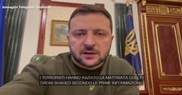 «Questa mattina i terroristi hanno lanciato 13 (droni) Shahed... tutti e 13 sono stati abbattuti dalle nostre forze di difesa aerea. Ben fatto ragazzi. Sono orgoglioso!», ha detto Zelensky in un video postato su Telegram, aggiungendo: «Non ignorate gli avvisi di raid aerei». Lo riporta il Guardian.