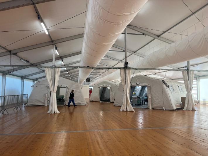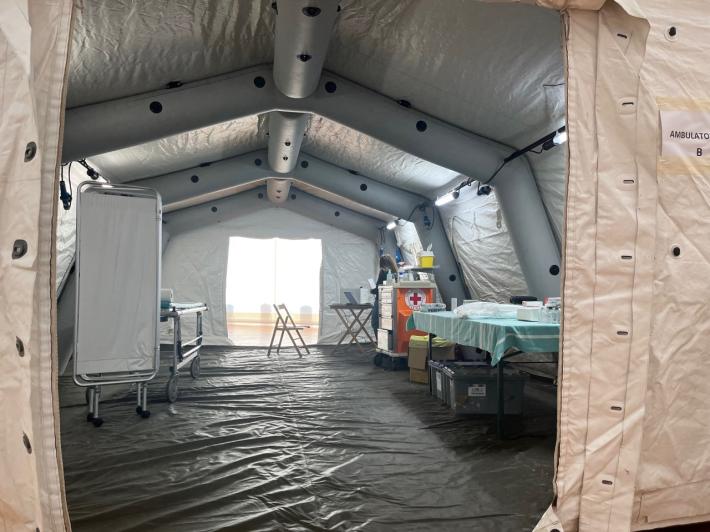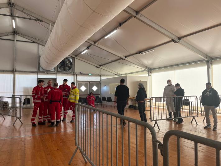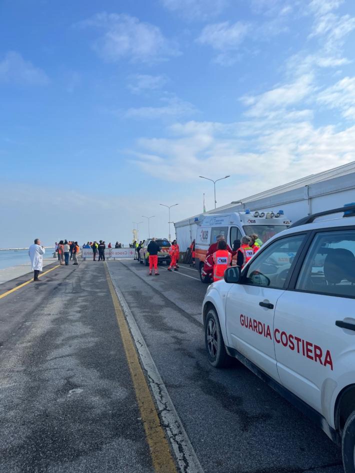 E’ circa mezzogiorno e mezzo dell’ultimo giorno del 2022 quando la Ocean Viking, con a bordo 113 migranti provenienti dalla Libia, tocca la banchina del porto di Ravenna, al terminal crociere. Molti di loro si affacciano dal parapetto della nave. Qualcuno saluta il personale a terra, che in pochi giorni si è preparato ad accogliere questo sbarco eccezionale per la città e per la Regione Emilia-Romagna, che mai prima d’ora avevano fatto fronte a un evento del genere. Scendono prima le donne, 23 in tutto, di cui una in stato avanzato di gravidanza e i bambini. Ci sono 35 minori non accompagnati. Tutti - donne, uomini e bambini - toccano terra senza scarpe e avvolti nelle coperte o in ampi giacconi, portando con se sacchi azzurri con i loro pochi averi. Subito il personale della Croce Rossa fornisce loro stivali, scarpe e ciabatte, suddivisi per misure. Un’operatrice con un costume da clown insieme a una manciata di colleghi ha anche portato una grande scatola di dolciumi. Man mano che scendono, vengono fatti entrare nella tensostruttura del terminal, un grande capannone riscaldato che corre per 200 metri lungo la banchina, dove si trovano i presidi medici (vengono subito effettuati i test Covid e i positivi divisi dai non positivi), un’a rea sociale per rifocillarsi e quella per l’identificazione. Sono stati predisposti per l’occasione, visto che questa è una struttura prettamente estiva. Dentro al capannone, una donna tiene in braccio un neonato di 17 giorni e cerca di calmarlo mentre piange. Quella che forse è sua sorella maggiore lo bacia sulla guancia.