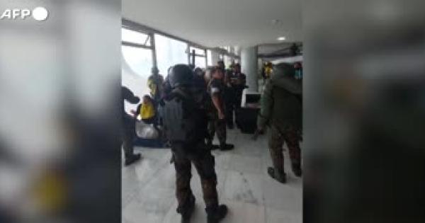 Agenti in tenuta antisommossa bloccano un gruppo di estremisti nel Pala'cio do Planalto