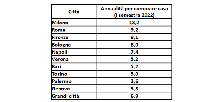 Secondo le ultime indagini dell’Ufficio Studi del Gruppo Tecnocasa, occorrono 6,9 annualità per acquistare casa nelle grandi città nel primo semestre del 2022.