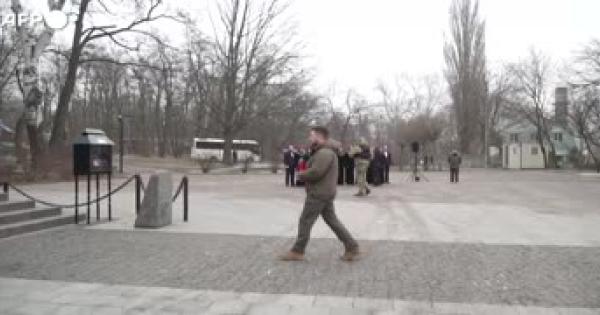 Pone una candela davanti al monumento alla Menorah di Kiev
