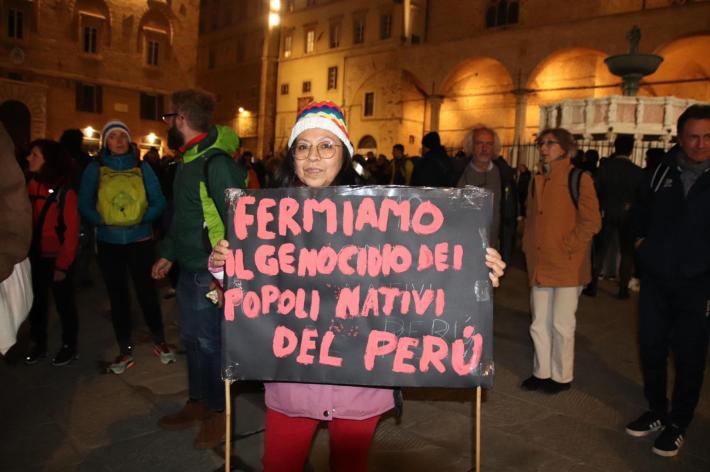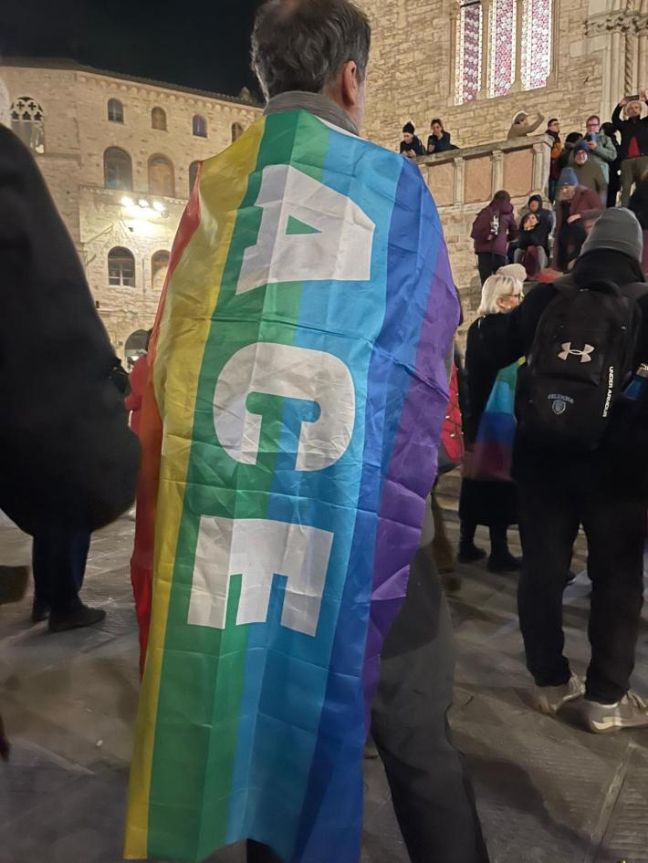 Una volta ad Assisi i partecipanti si sono fermati in piazza facendo sventolare un grande drappo con i colori della bandiera pacifista. «Siamo qui in questo tragico anniversario per assumerci una responsabilità in più» ha detto stanco ma felice Flavio Lotti. «Per fare - ha aggiunto - quello che ancora non è stato fatto».