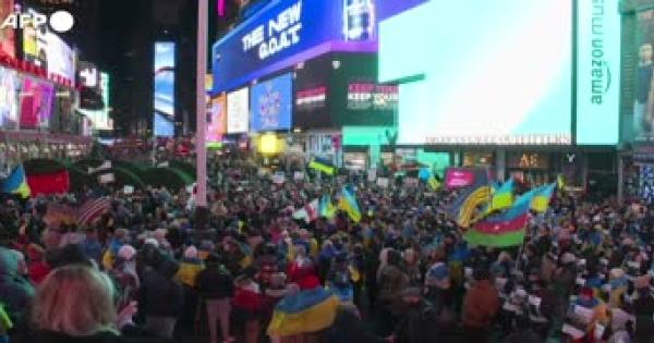 A Times Square, tantissime bandiere dell'Ucraina e numerosi cartelli