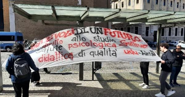 (ANSA) - ANCONA, 28 MAR - Protesta davanti al Teatro delle Muse ad Ancona, dove si celebra l'apertura dell'anno accademico dell'Università Politecnica delle Marche alla presenza dei ministri Anna Maria Bernini (Università e Ricerca) e Orazio Schillaci (Salute): esponenti delle associazioni studentesche Gulliver Udu Ancona hanno esposto uno striscione con la scritta in rosso e nero: "Meritevoli di un futuro: diritto allo studio, salute psicologica e didattica di qualità". "l'università è pubblica e non si tocca, la difenderemo con la lotta", hanno gridato gli studenti" e "ministra pagaci le borse", all'arrivo della ministra Bernini. (ANSA).