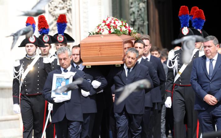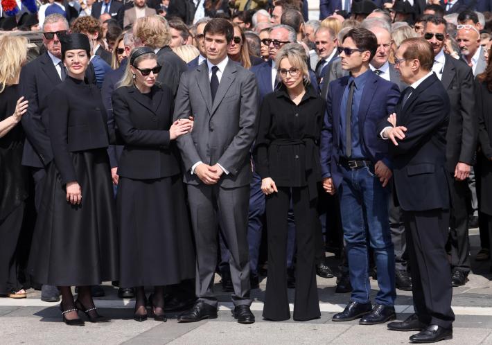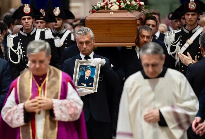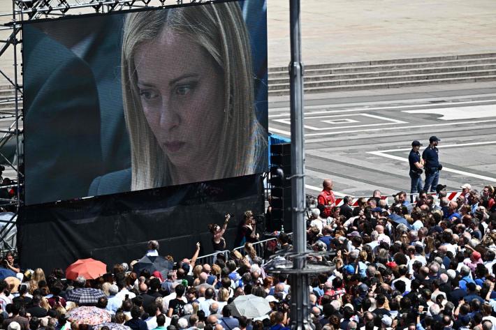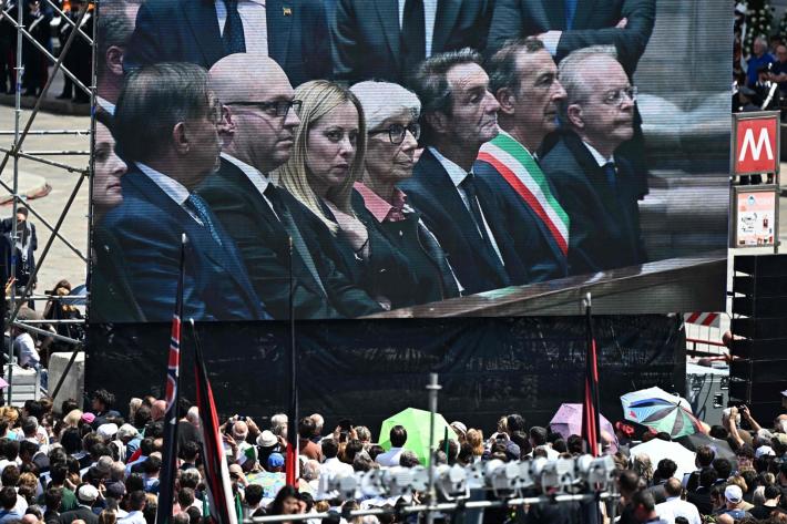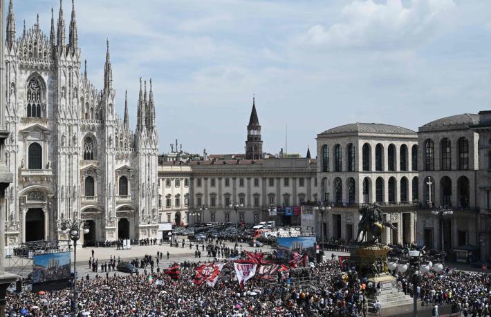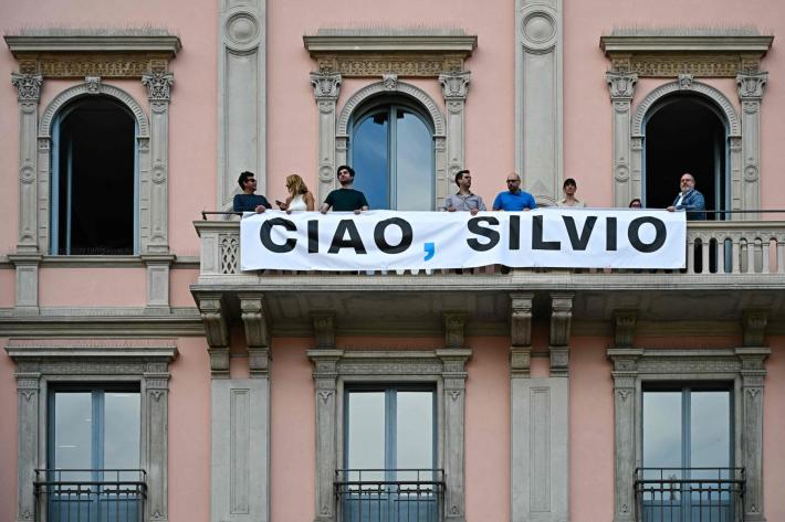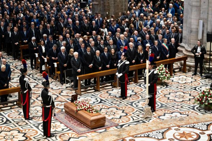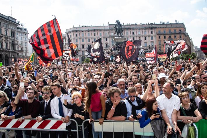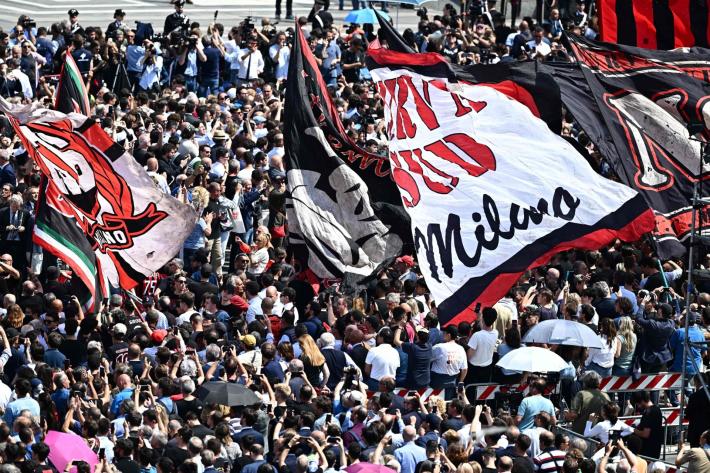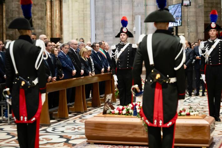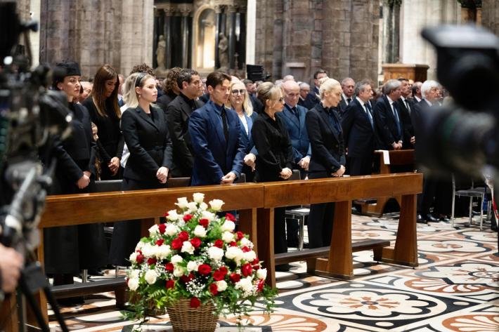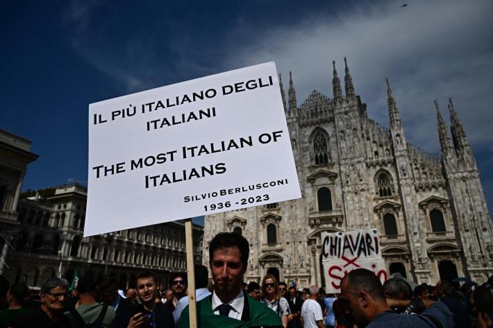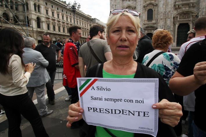 L'addio a Silvio Berlusconi in Duomo a Milano: piazza gremita, cartelli, sostenitori e tifosi del Milan. Ecco una fotogallery.