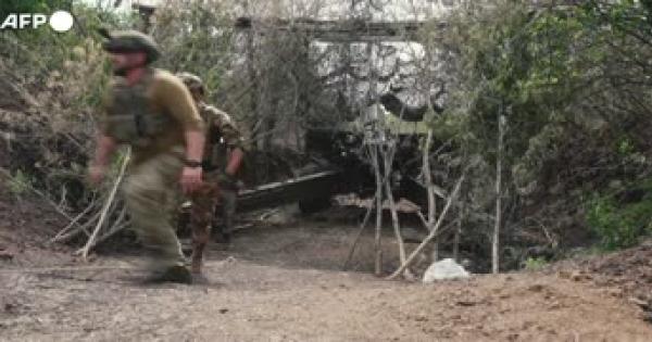 Gruppo di soldati ucraini spara con un cannone da campo 2A36 Giatsint-B contro le posizioni russe