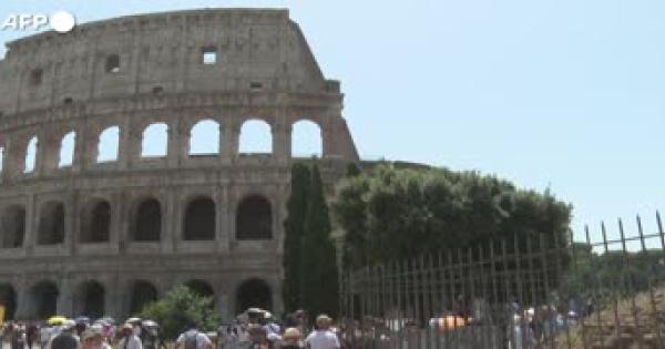 Visitatori in fila con cappelli, ombrelli e ventagli per ripararsi dall'afa