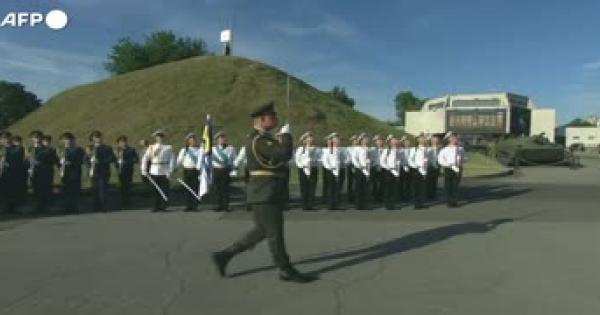 Il vessillo piu' grande del Paese issato a Kiev con le firme dei soldati impegnati al fronte