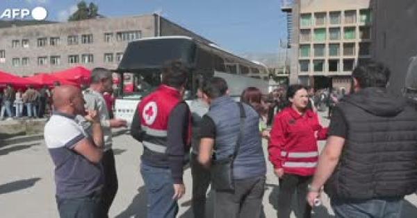 A Goris gli operatori umanitari accolgono le persone in arrivo dall'enclave