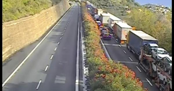 (ANSA) - TAGGIA, 20 OTT - E' un unico serpentone di auto e mezzi pesanti da Mentone, in Francia (sull'A8), fino a oltre il casello di Taggia, direzione Italia. Una coda di 32 chilometri che interessa l'Autostrada dei Fiori, ormai in ginocchio a causa di uno scontro tra un tir e un'auto, che si è verificato verso le 8.20 di stamani. Il problema non è stato l'impatto tra i due mezzi, che non ha avuto conseguenze sulle persone, ma una vasta chiazza di gasolio fuoriuscita dal mezzo pesante e riversata sull'asfalto e il danno a circa venti metri di guard rail, che dev'essere ripristinato. La centrale operativa dell'A10 ha riaperto la circolazione su una sola corsia, ma ha già annunciato che la tratta tra Arma di Taggia e Imperia Ovest resterà chiusa tra le 21 e le 6 di domattina, per consentire di completare le operazioni di bonifica nel punto in cui è avvenuto l'incidente. il traffico sarà dirottato sull'Aurelia (ANSA).