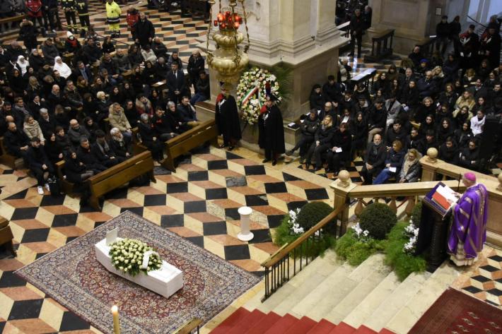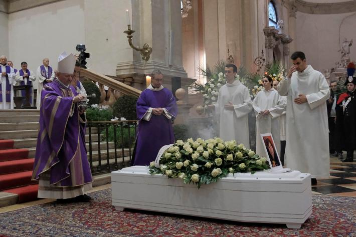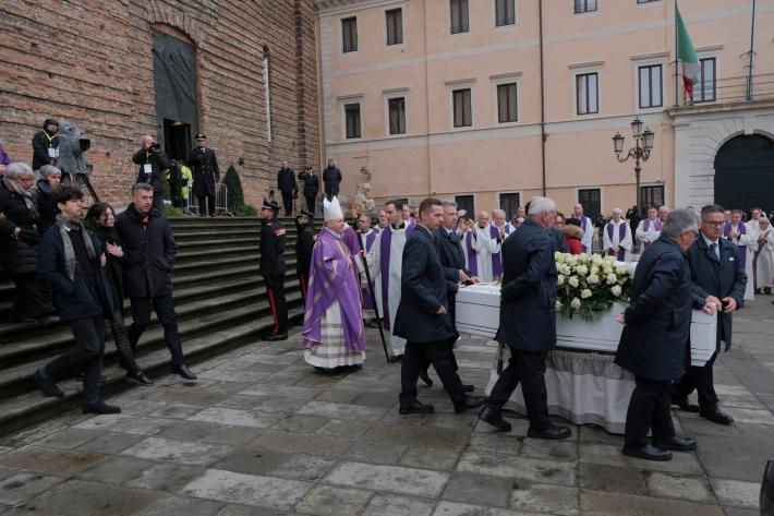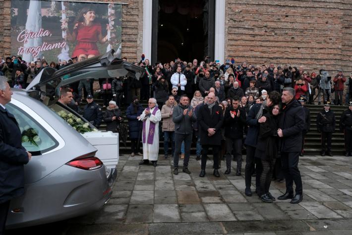 Al rito delle esequie, officiato dal vescovo Claudio Cipolla, presenti, tra le altre autorità, il ministro della giustizia, Carlo Nordio, in rappresentanza del governo, i parlamentari Laura Boldrini, Alessandro Zan, Antonio De Poli, il presidente del Veneto, Luca Zaia, che ha disposto il lutto regionale e le bandiere a mezz'asta, il presidente del Consiglio regionale, Roberto Ciambetti, il sindaco di Padova Sergio Giordani, la rettrice dell’università patavina, Daniela Mapelli, che ha disposto fino alle ore 14 la sospensione delle lezioni in quello che era l’ateneo di Giulia, prossima alla laurea in ingegneria biomedica. I funerali sono iniziati come da programma alle ore 11 e sono stati trasmessi in diretta televisiva. "Non avremmo voluto vedere quello che i nostri occhi hanno visto, né ascoltare quanto appreso nella tarda mattinata di sabato 18 novembre - ha esordito il vescovo di Padova, Monsignor Claudio Cipolla, nel corso dell’omelia - Per sette lunghi giorni abbiamo sperato di vedere e sentire cose diverse, invece ora siamo qui con gli occhi, anche quelli del cuore, pieni di lacrime. Abbiamo bisogno di parole e gesti di sapienza, che ci aiutino a non restare intrappolati nell’immane tragedia che si è consumata. In noi ci sono amarezza e rabbia, ma quanto abbiamo vissuto ha ha reso evidente il desiderio di trasformare il dolore in impegno, per una società migliore che abbia rispetto della persona, donna o uomo che sia - ha aggiunto - Il suo sorriso mancherà a tutta la famiglia, agli amici, a tutti noi, perché il suo viso ci è diventato caro. Il vescovo, che ha sottolineato i concetti di attesa, speranza e amore, ricordando come il volto di Giulia resterà impresso nella memoria di chi l’ha conosciuto, si è rivolto in conclusione anche all’omicida reo confesso, che si trova nel carcere Montorio di Verona, dal quale ha avuto la possibilità di seguire i funerali in tv come tutti gli altri reclusi: "Chiediamo la pace del cuore anche per Filippo e la sua famiglia. Il nostro cuore cerca tenerezza, comprensione, affetto, amore. La pace del cuore è pace con se stessi, con il proprio corpo, con la propria psiche, con i propri sentimenti". Intervenuto nel corso della cerimonia delle Stelle al merito del lavoro al Quirinale, il presidente della Repubblica, Sergio Mattarella, ha ribadito - mentre a Padova erano in corso le esequie - come "il valore e il rispetto della vita" debbano essere "riaffermati con determinazione in ogni ambito, circostanza e dimensione".