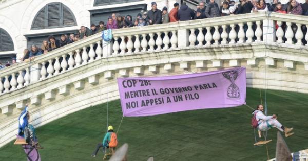 (ANSA) - MILANO, 09 DIC - Blitz ambientalista contro al Cop 28 di Extinction Rebellion che questo pomeriggio ha tinto di verde il Naviglio Grande a Milano appendendo anche al ponte Alda Merini la scritta 'Il governo parla, la terra affonda'. Sul ponte gli attivisti hanno anche inscenato una sorta di flash mob sdraiandosi a terra con addosso dei cartelli e hanno fatto affondare una casa di carta perché, hanno spiegato in una storia su Instagram, "stiamo letteralmente affondando". "A Milano - hanno spiegato gli ambientalisti che stanno facendo azioni simili in altre città - anche Debt for Climate, la campagna internazionale che promuove la remissione del debito dei Paesi del sud del mondo per agevolarne la decarbonizzazione". La sostanza utilizzata, hanno poi precisato, è "fluoresceina, un sale innocuo per le persone e per la flora e la fauna. Infatti è usato da geologi, speleologi e anche da idraulici!". (ANSA).