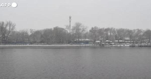 Un gruppo di nuotatori sfida il freddo con un tuffo nel lago Houhai