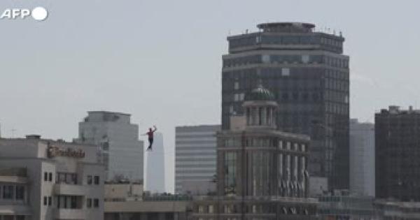 Nathan Paulin, funambolo francese, ha completato una camminata di 300 metri attraversando un viale di Santiago del Cile a 50 metri d'altezza.