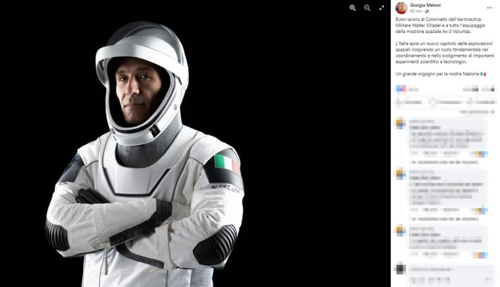 «Sono felicissima di essere a bordo con lei anche se virtualmente, siamo collegati dal Colosseo uno dei simboli più straordinari della nostra identità e della nostra storia millenaria». Lo ha detto la presidente del consiglio Giorgia Meloni collegata dal Colosseo con il Colonnello dell’Aeronautica Militare, Walter Villadei, a bordo della ISS per la missione Axiom Space 3 (Ax-3).
