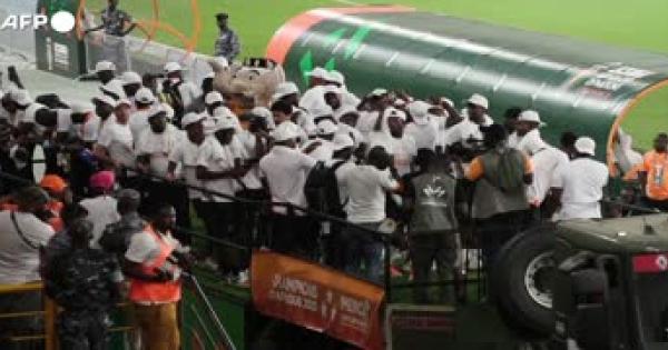 Giro di campo a bordo di un camion con rimorchio esibendo il trofeo ai tifosi