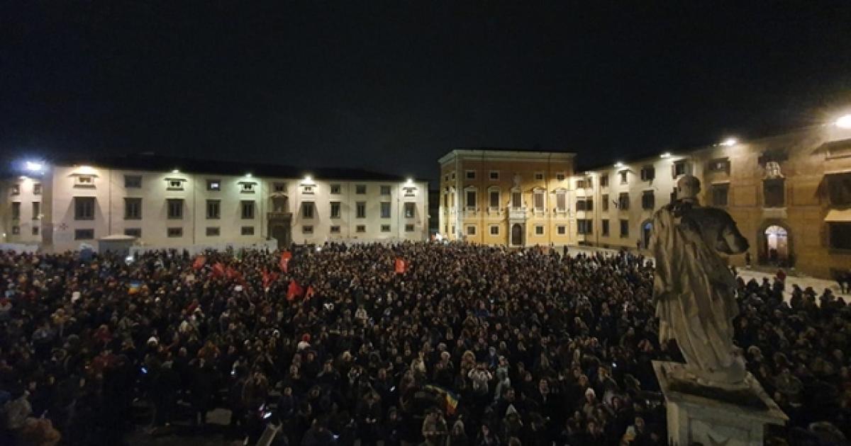 (ANSA) - PISA, 23 FEB - In piazza dei Cavalieri, la piazza del centro di Pisa dove stamani le cariche della polizia hanno impedito il passaggio di un corteo pro Palestina composto da un centinaio di studenti, si sono radunate questa sera 5mila persone, secondo la questura, per esprimere pacificamente solidarietà ai manifestanti di stamani. La manifestazione si è svolta pacificamente, vigilata a distanza da un discreto servizio d'ordine di agenti in borghese, ed è stata originata da due distinti presidi convocati alla stessa ora sotto il Comune e sotto al prefettura, rispettivamente dalle forze della sinistra radicale e antagonista e dai partiti del centrosinistra insieme a sindacati e associazionismo. Sulla scalinata monumentale della Scuola Normale che si affaccia sulla piazza sono stati affissi striscioni con le scritte "Stop genocidio", "Palestina libera", "Basta violenza della polizia" e "No alla violenza delle istituzioni". Scanditi anche slogan "vergogna vergogna", e "caricateci ora" all'indirizzo delle forze dell'ordine. (ANSA).