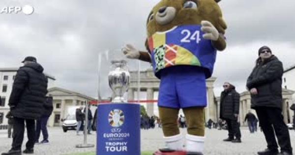 La coppa e la mascotte dei prossimi Europei davanti alla Porta di Brandeburgo