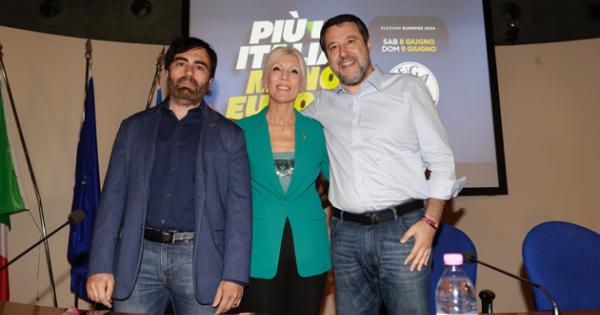Matteo Salvini, leader della Lega e ministro alle Infrastrutture risponde alle domande dei giornalisti prima della presentazione del suo libro “Controvento” alla Corte di Giarola.