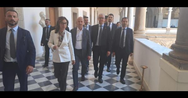 (ANSA) - PALERMO, 21 MAG - Visita a Palazzo dei Normanni, sede dell'Assemblea siciliana, per il ministro dell'Istruzione e del merito Giuseppe Valditara, oggi a Palermo. Dopo avere ammirato i tesori della cappella Palatina accompagnato dall'assessore regionale all'Istruzione Mimmo Turano, il ministro è stato accolto dal vice presidente dell'Ars Nuccio Di Paola, dal segretario generale Fabrizio Scimè e Filippo Palmeri, capo di gabinetto del presidente Gaetano Galvagno. Dopo una breve riunione, il ministro ha proseguito la visita del Palazzo e si è poi soffermato a sala d'Ercole, dove ha incontrato alcuni studenti seduti sugli scranni dei deputati. (ANSA).