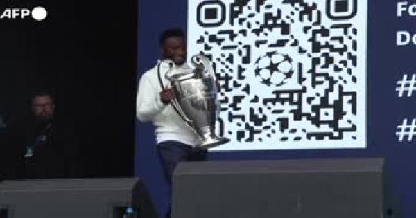 L'ambasciatore Uefa John Obi Mikel consegna il trofeo nella cerimonia di apertura a Trafalgar Square