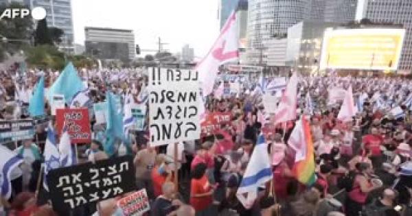 i manifestanti urlano slogan e esibiscono cartelli, alcuni dei quali ritraggono alcuni ostaggi