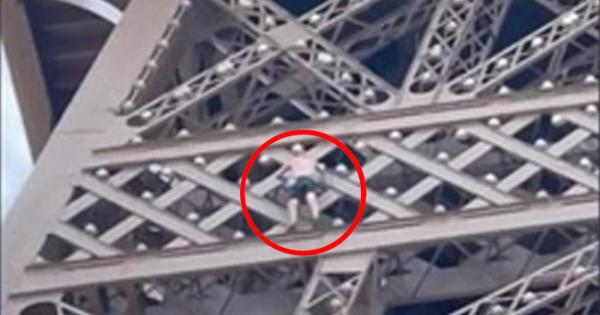 La Tour Eiffel è stata brevemente evacuata dai visitatori questo pomeriggio dopo che è stato avvistato un uomo, a torso nudo, che scalava il monumento appena al di sopra dei cinque cerchi olimpici.